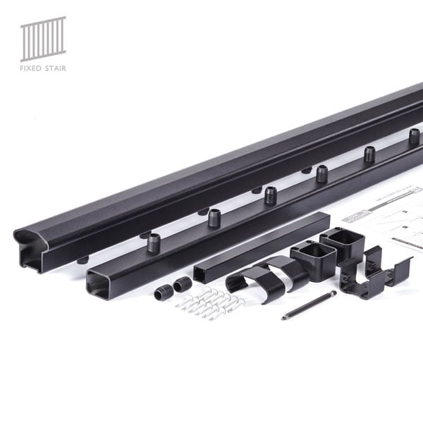 Series 100 Fixed Stair Rail Kit contains the Top Rail and the Bottom Rail of the rail section. The Baluster Connectors to mount the balusters to the rails are factory installed on both the Top and Bottom Rails. The Fixed Stair Rail is set at a 34 Degree angle. Once assembled, the rail will adjust to accommodate a range of stair angles from 32 to 36 degrees. Also included are Two Top Rail and Two Bottom Rail Fixed Stair Post-to-Post Mounting Brackets, Support Block Material and Hardware for mounting the rails to any AFCO Aluminum Afco-Rail Post. Please note that the Angled Balusters required for the Fixed Stair Rail are not included. Series 100 Angled Baluster Kits are sold separately.